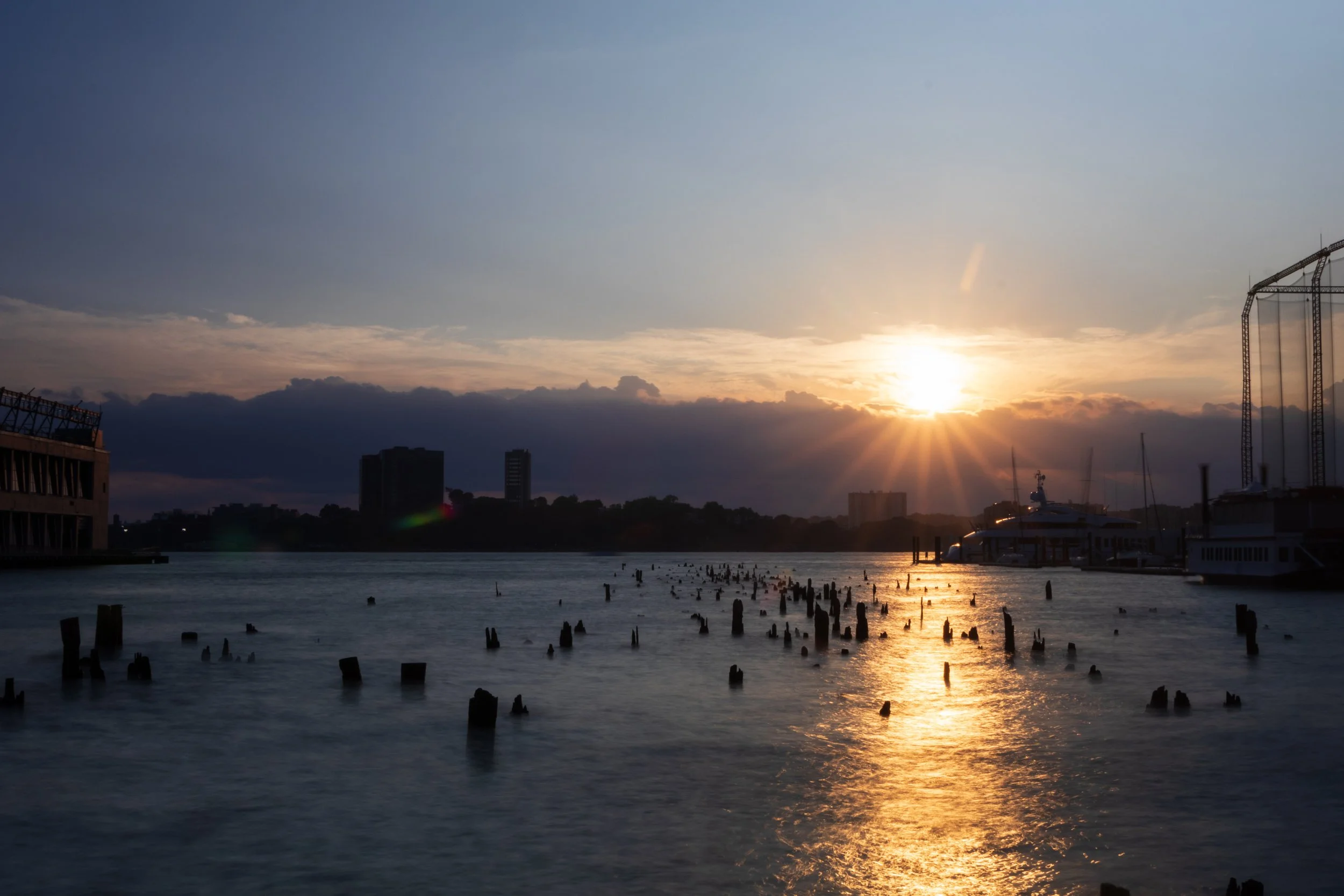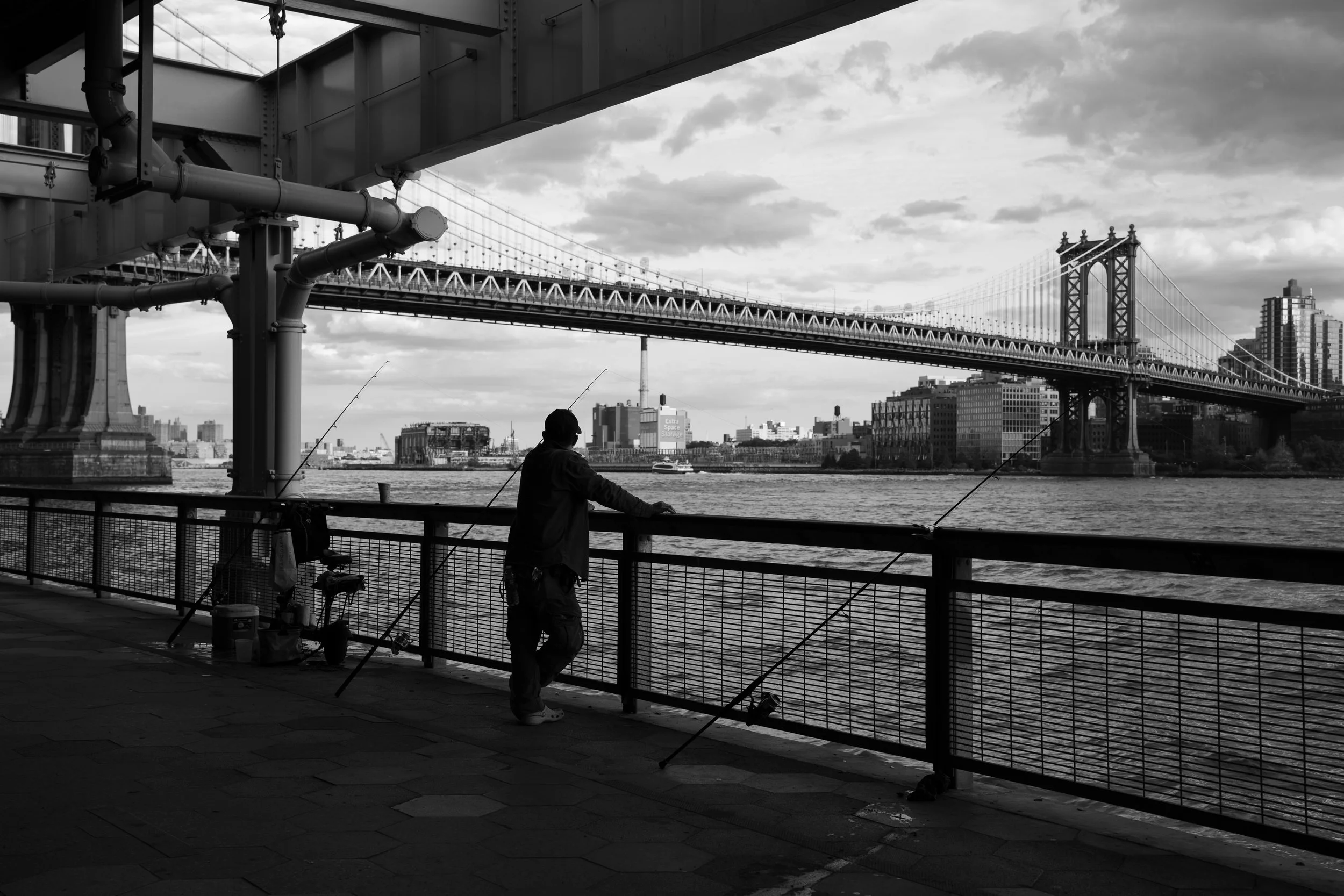 A person fishing along the river under a bridge in New York City, with city buildings in the background.