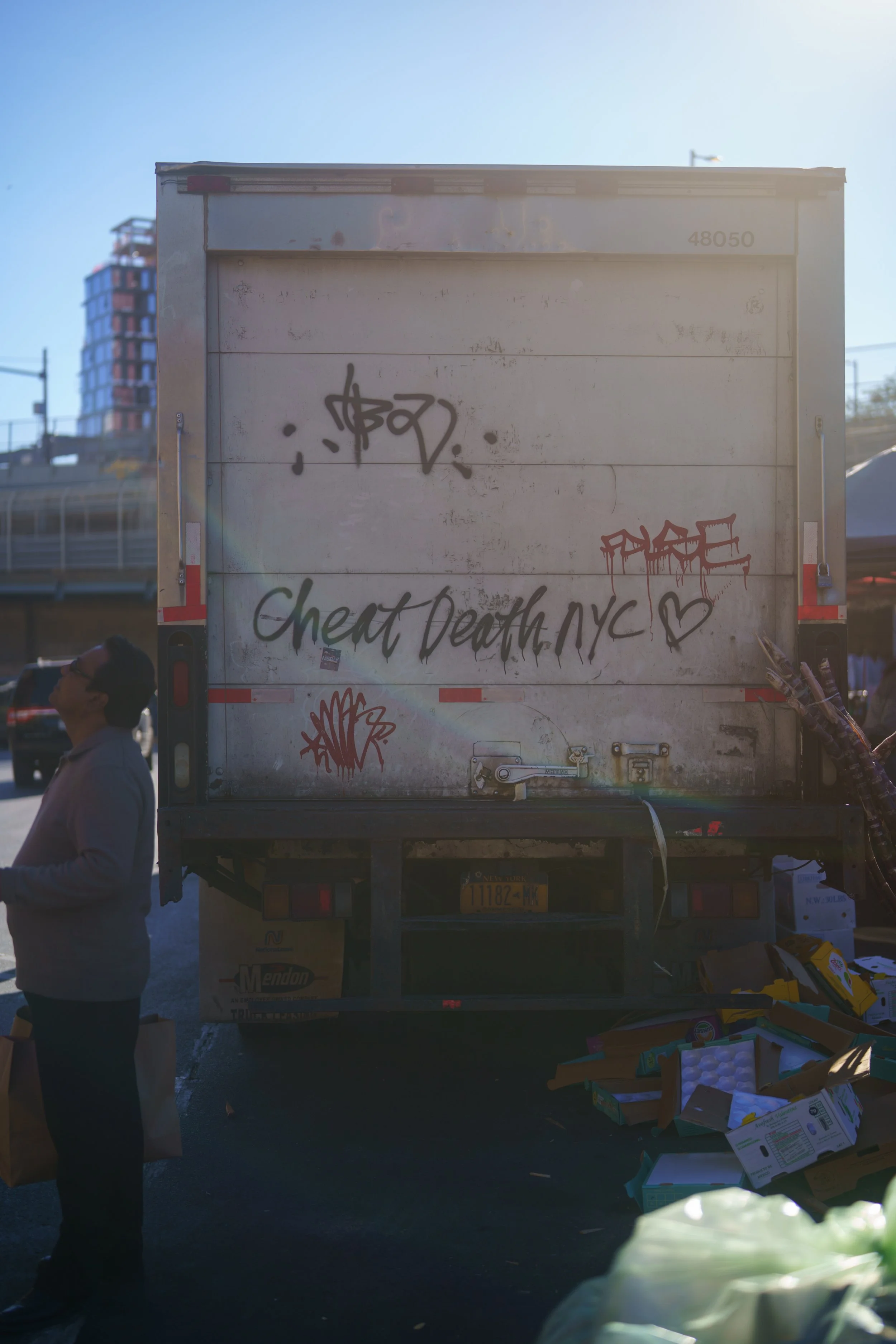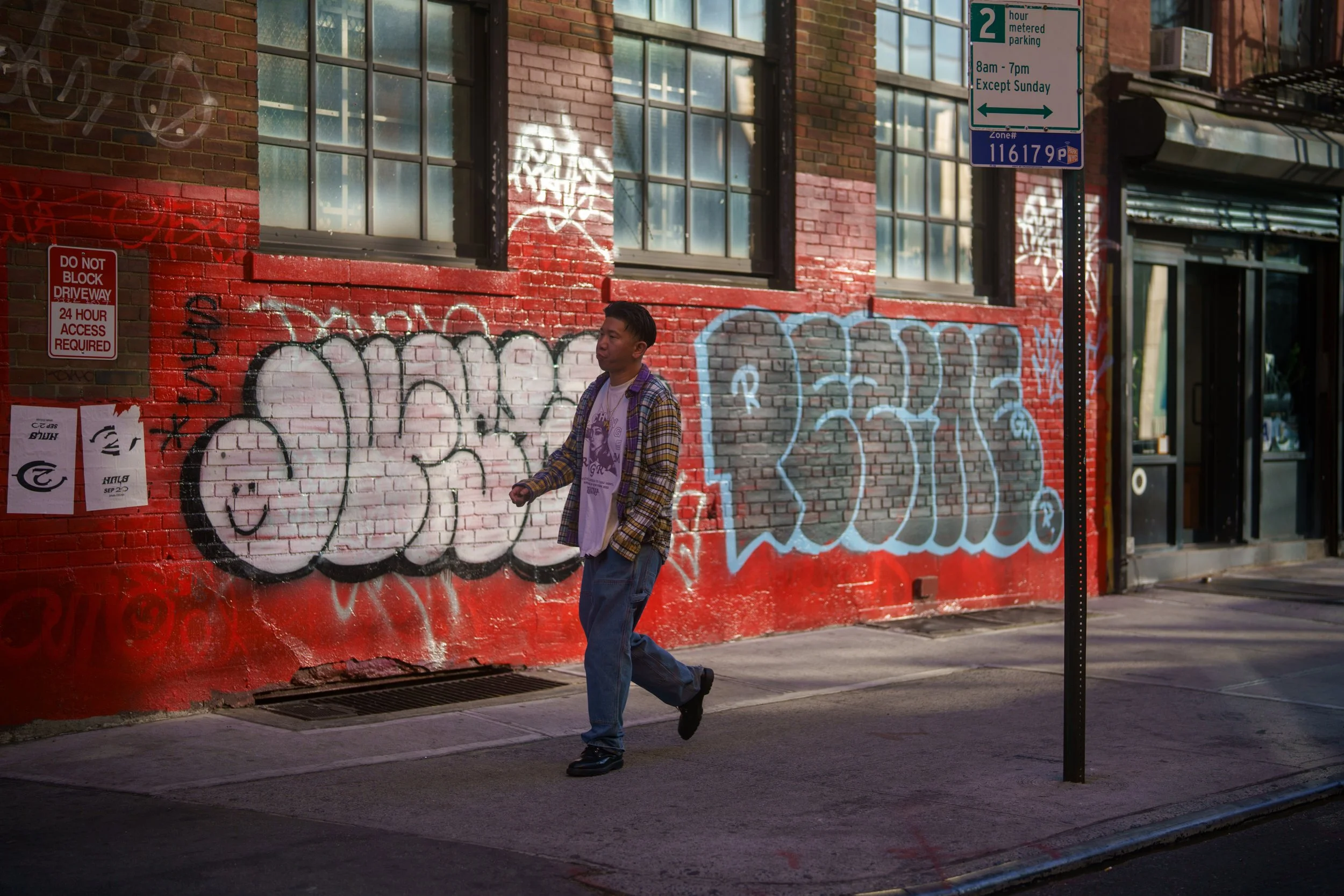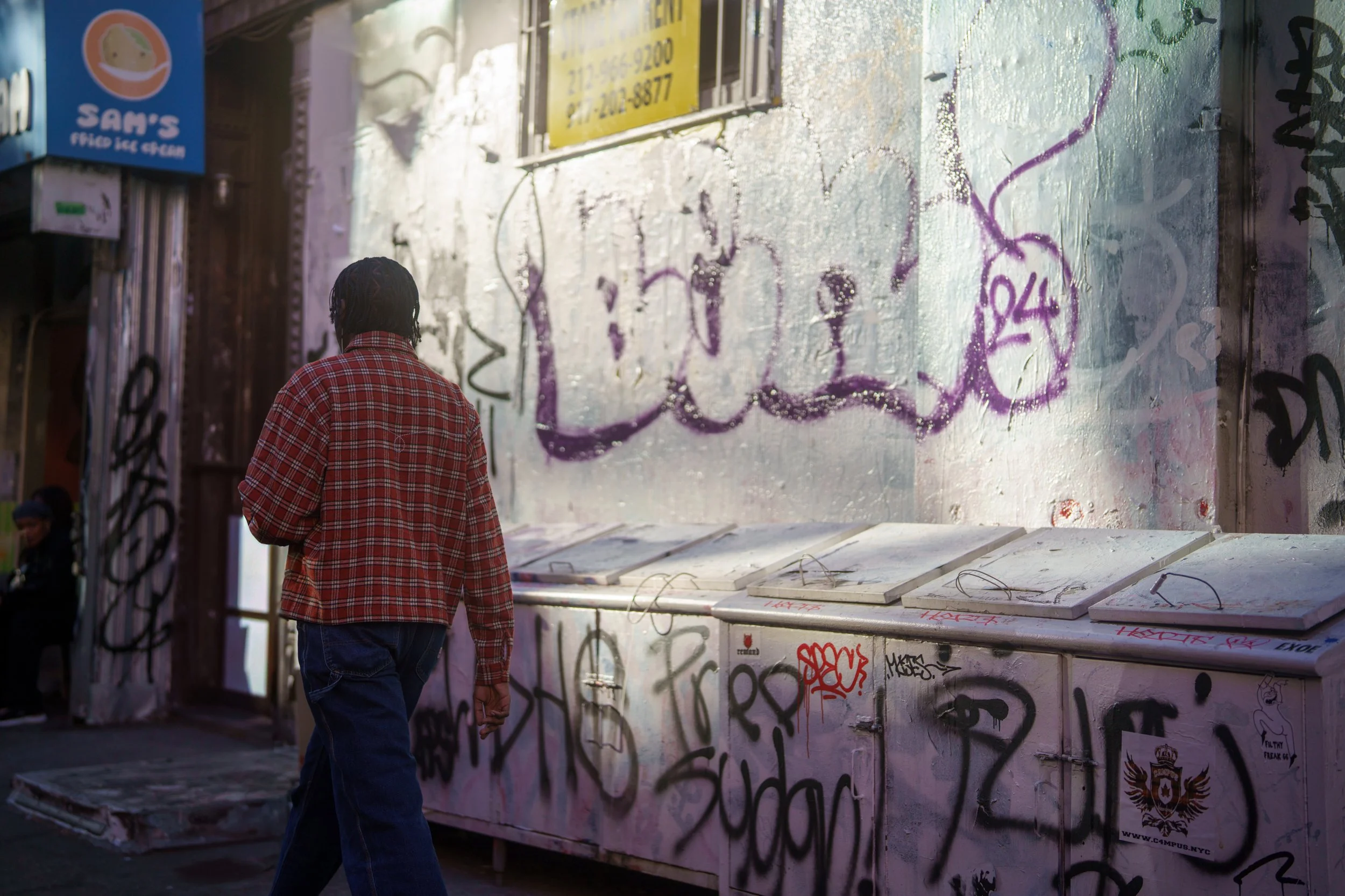 Grungy urban alleyway with a partially open roll-up door, yellowish translucent plastic curtain, graffiti on brick wall, and street signs indicating development threats and a museum entrance, with two people walking on the sidewalk.