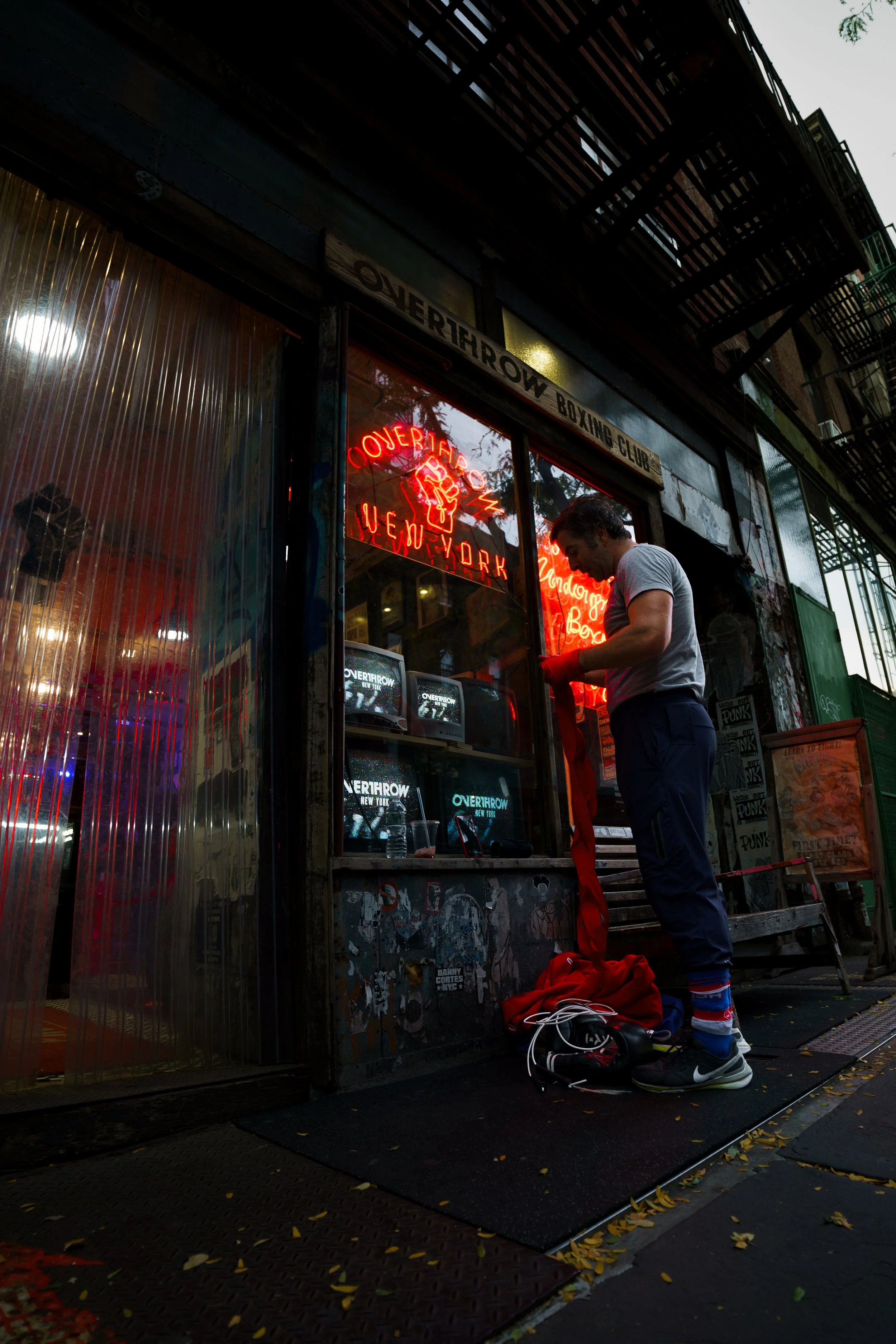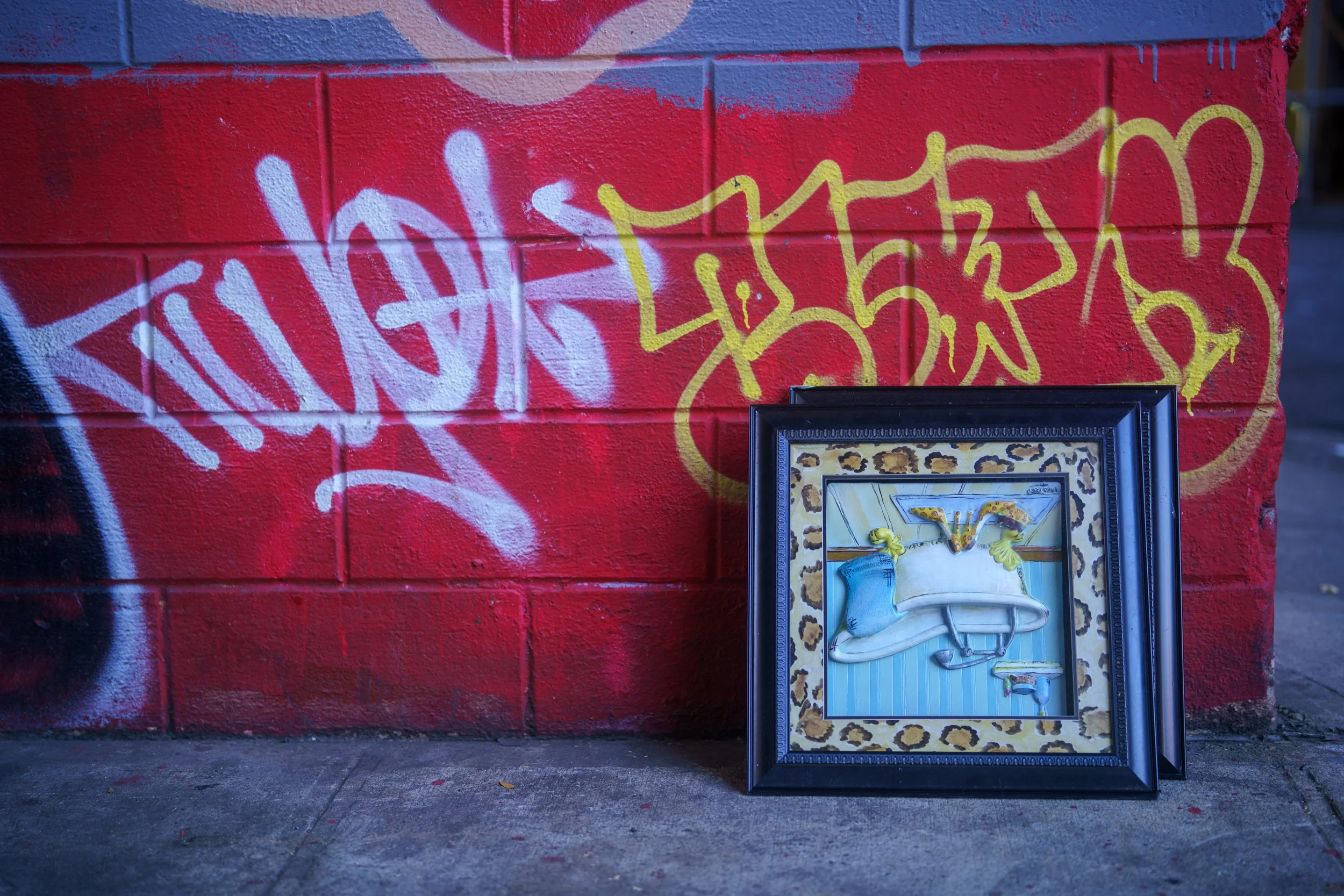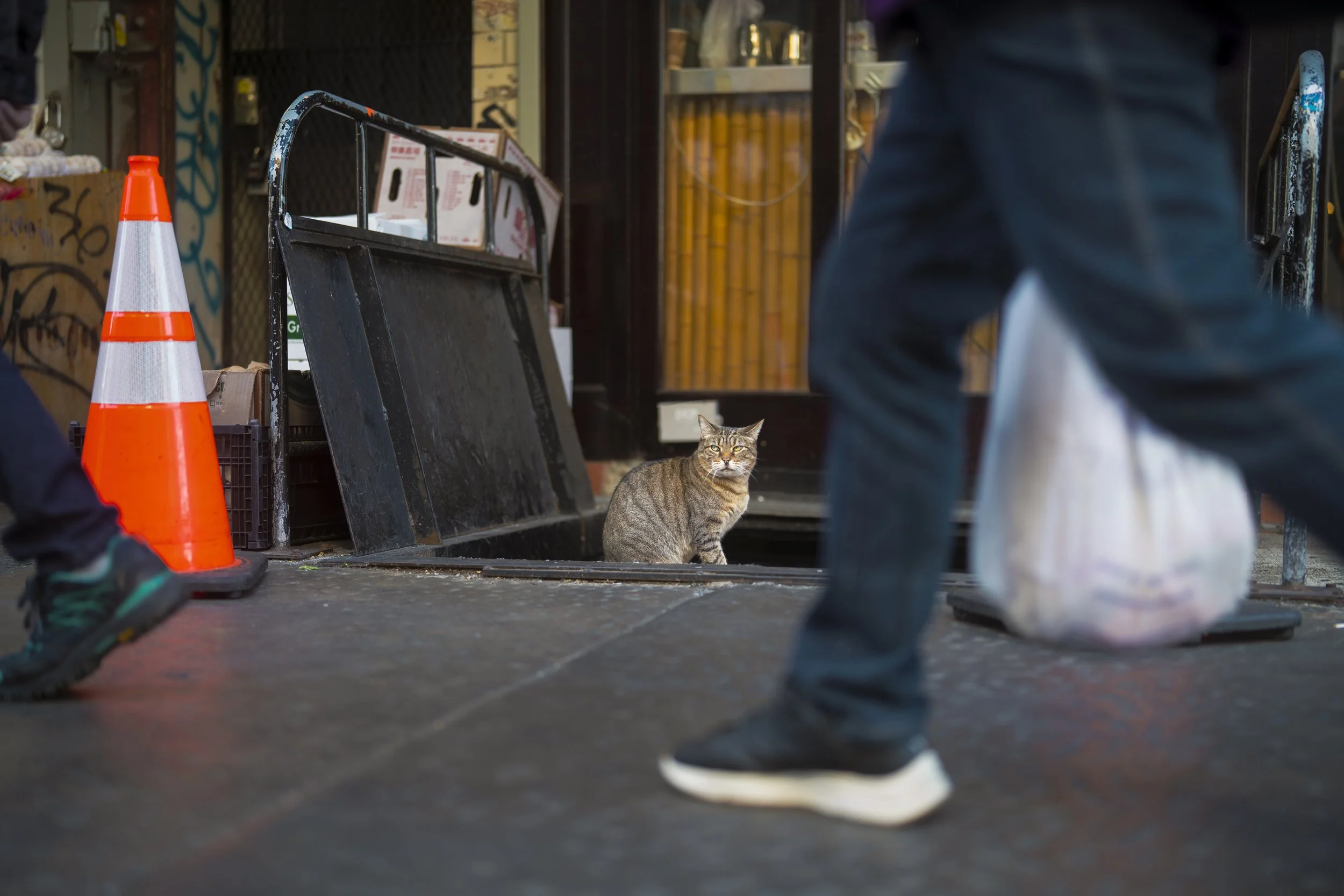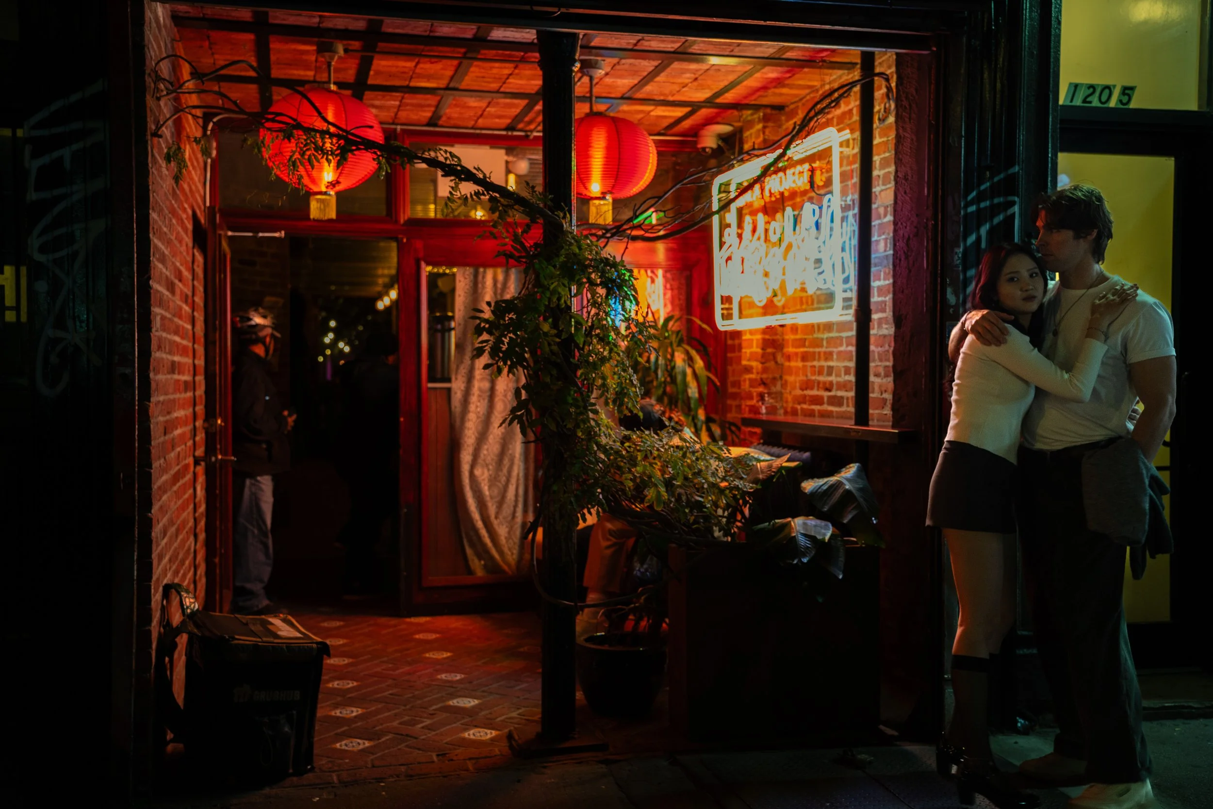Grungy urban alleyway with a partially open roll-up door, yellowish translucent plastic curtain, graffiti on brick wall, and street signs indicating development threats and a museum entrance, with two people walking on the sidewalk.