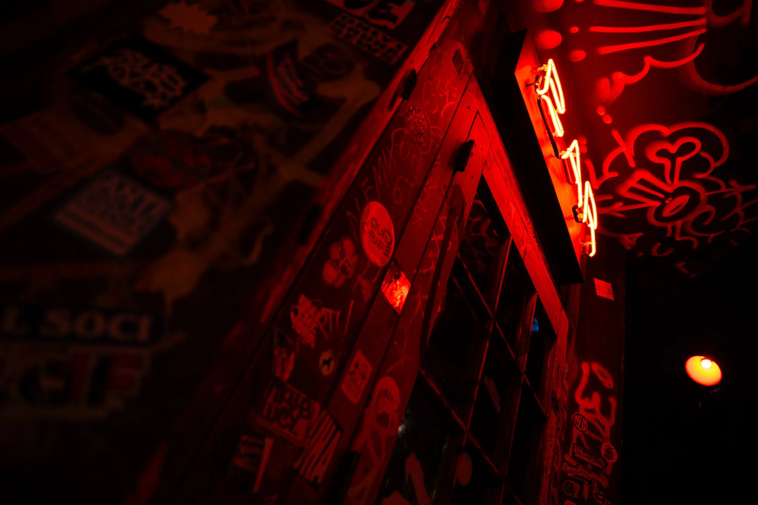 Red neon sign illuminating a wall covered with stickers and graffiti in a dimly lit room.