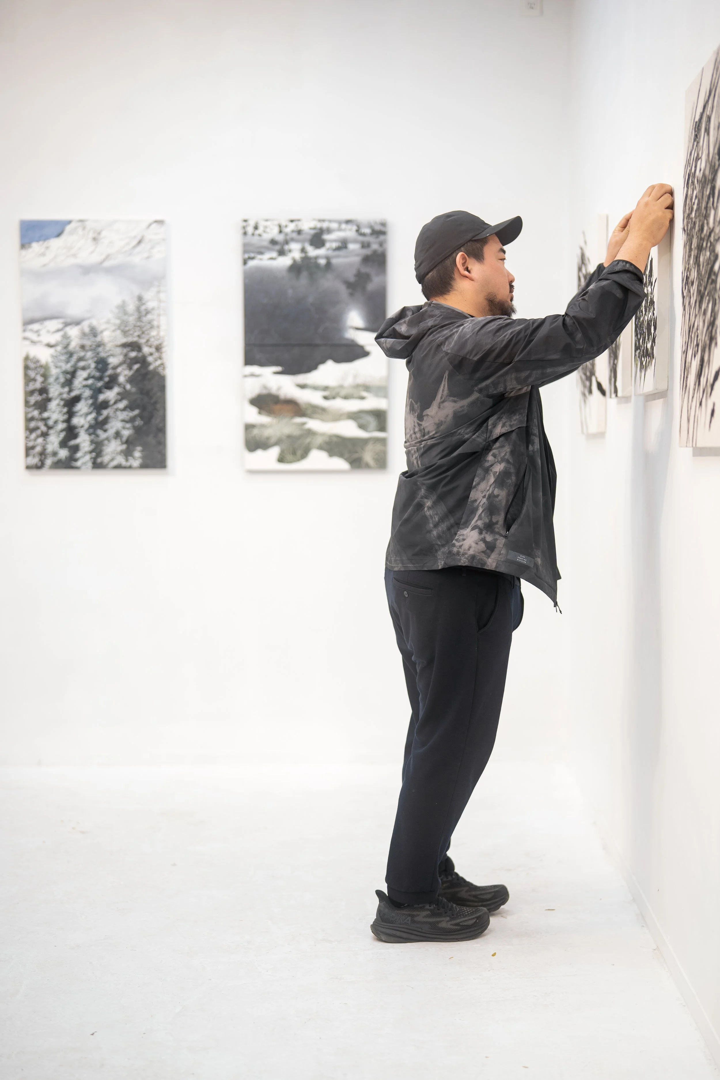Open glass door leading into a brightly lit art gallery with white walls and modern ceiling lighting, contrasted by dark graffiti-covered walls outside.