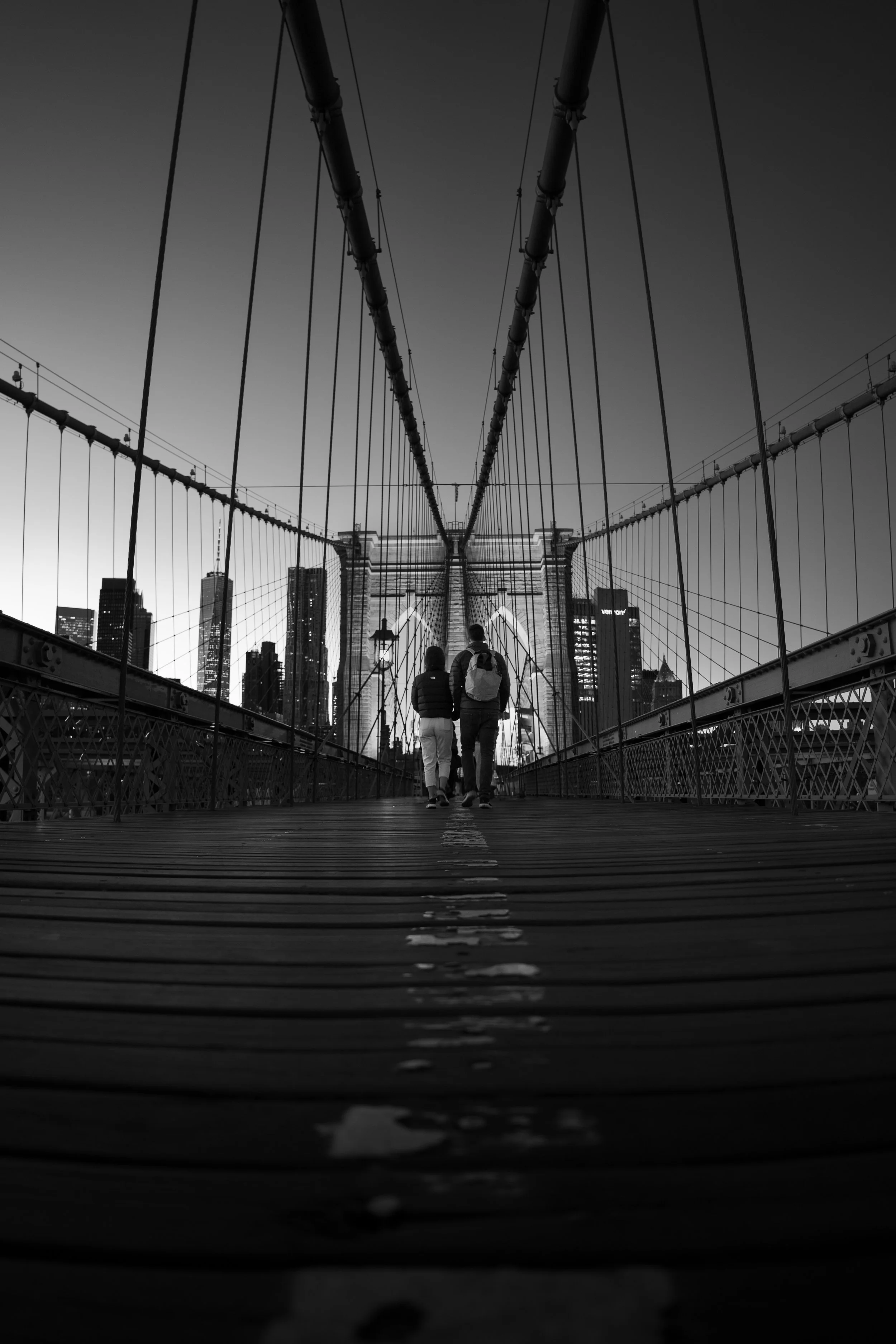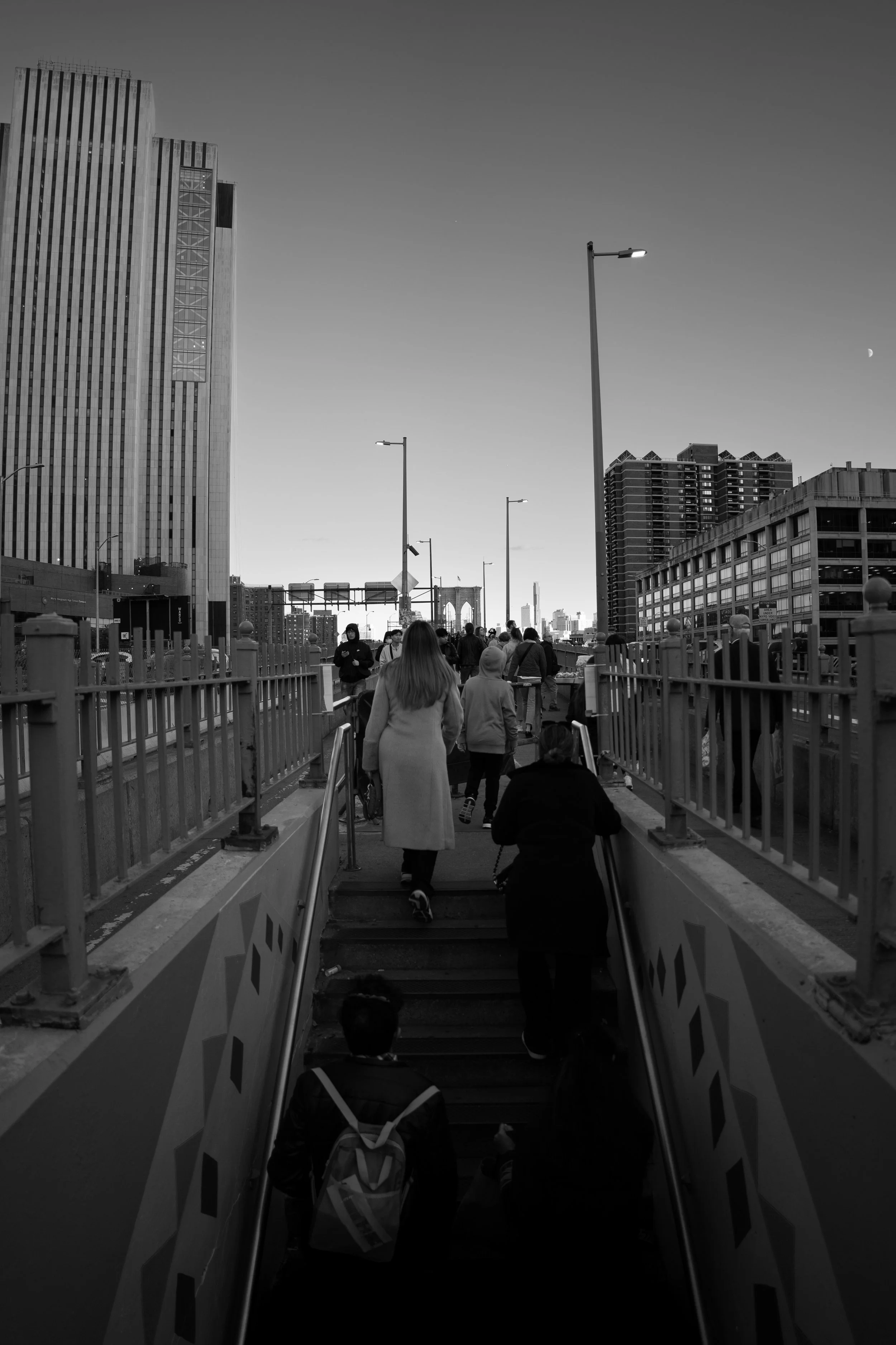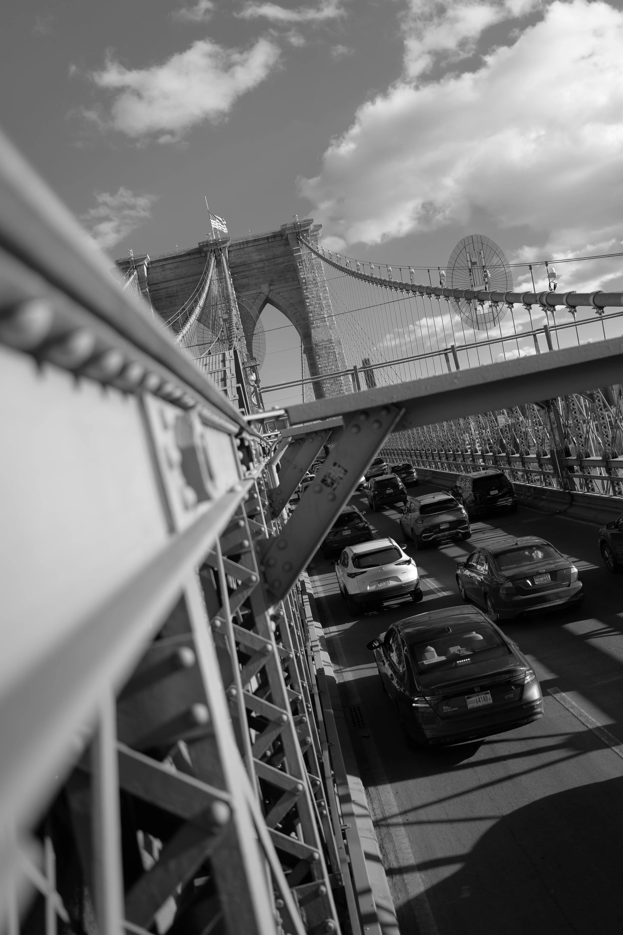 Silhouettes of four people taking photos with smartphones near a railing, with the Brooklyn Bridge and Manhattan skyline in the background under cloudy skies in black and white.