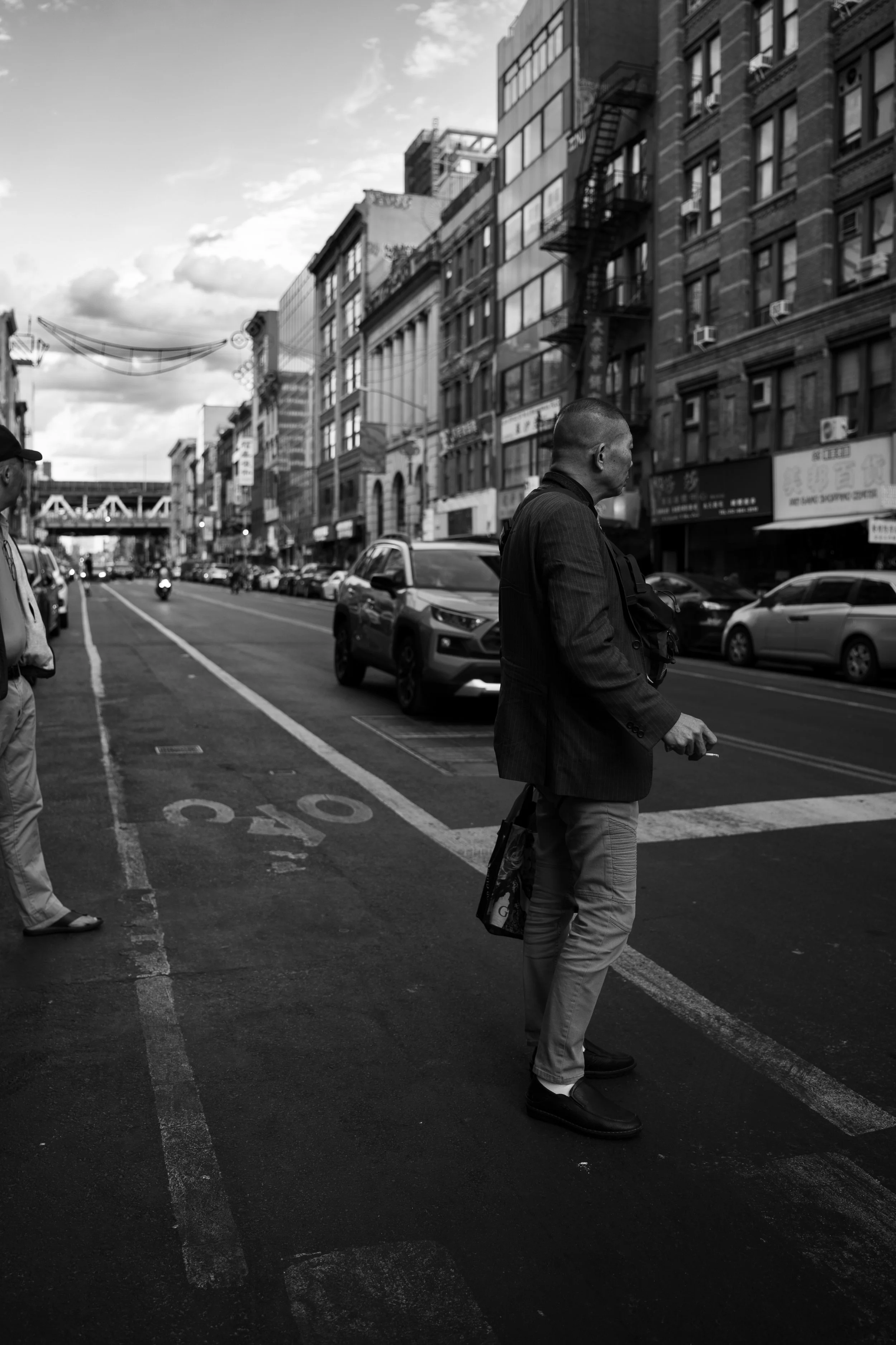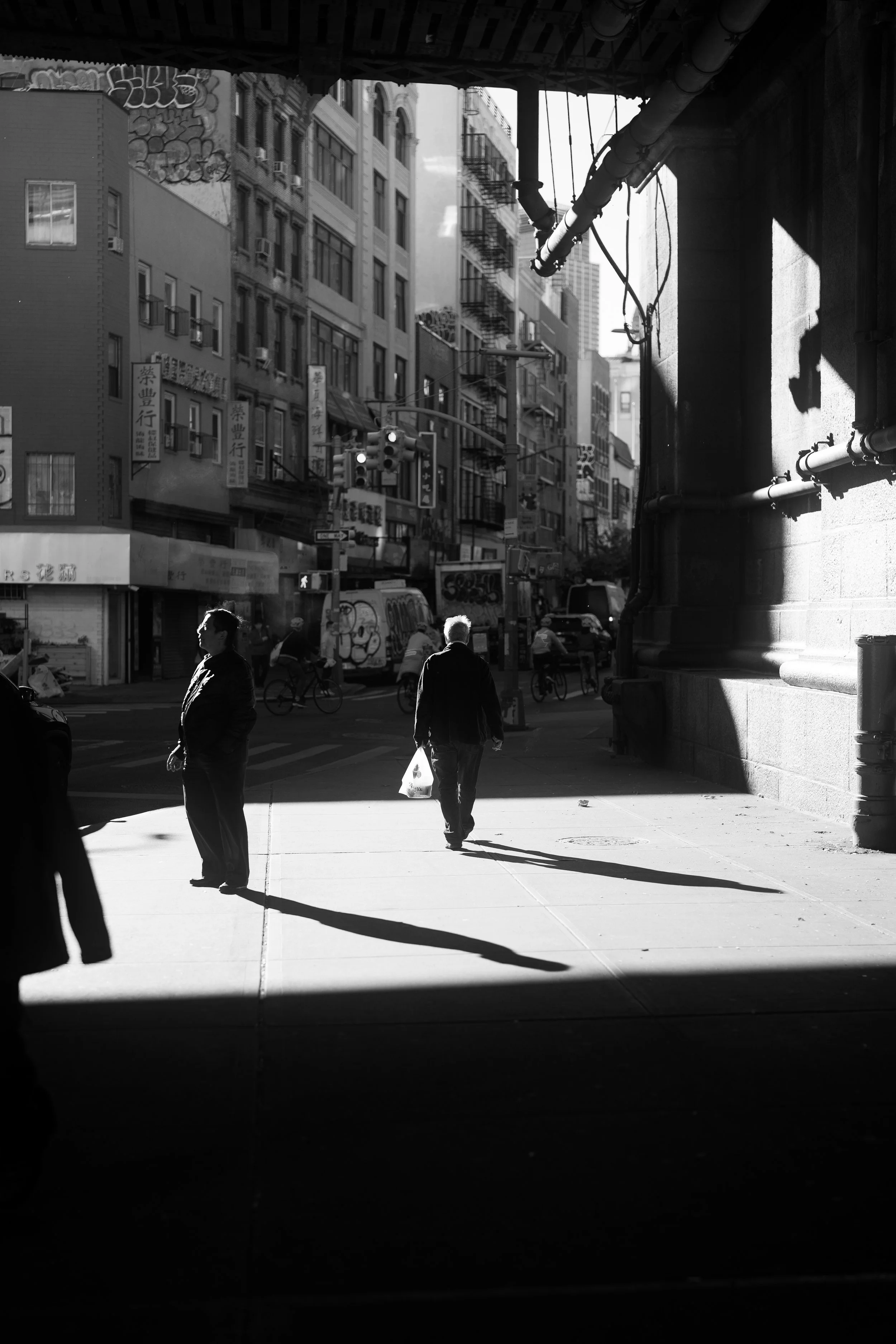 Black and white street scene with pedestrians walking on sidewalk, bicycles, and buildings with storefronts and signs in the background, with sunlight casting shadows.