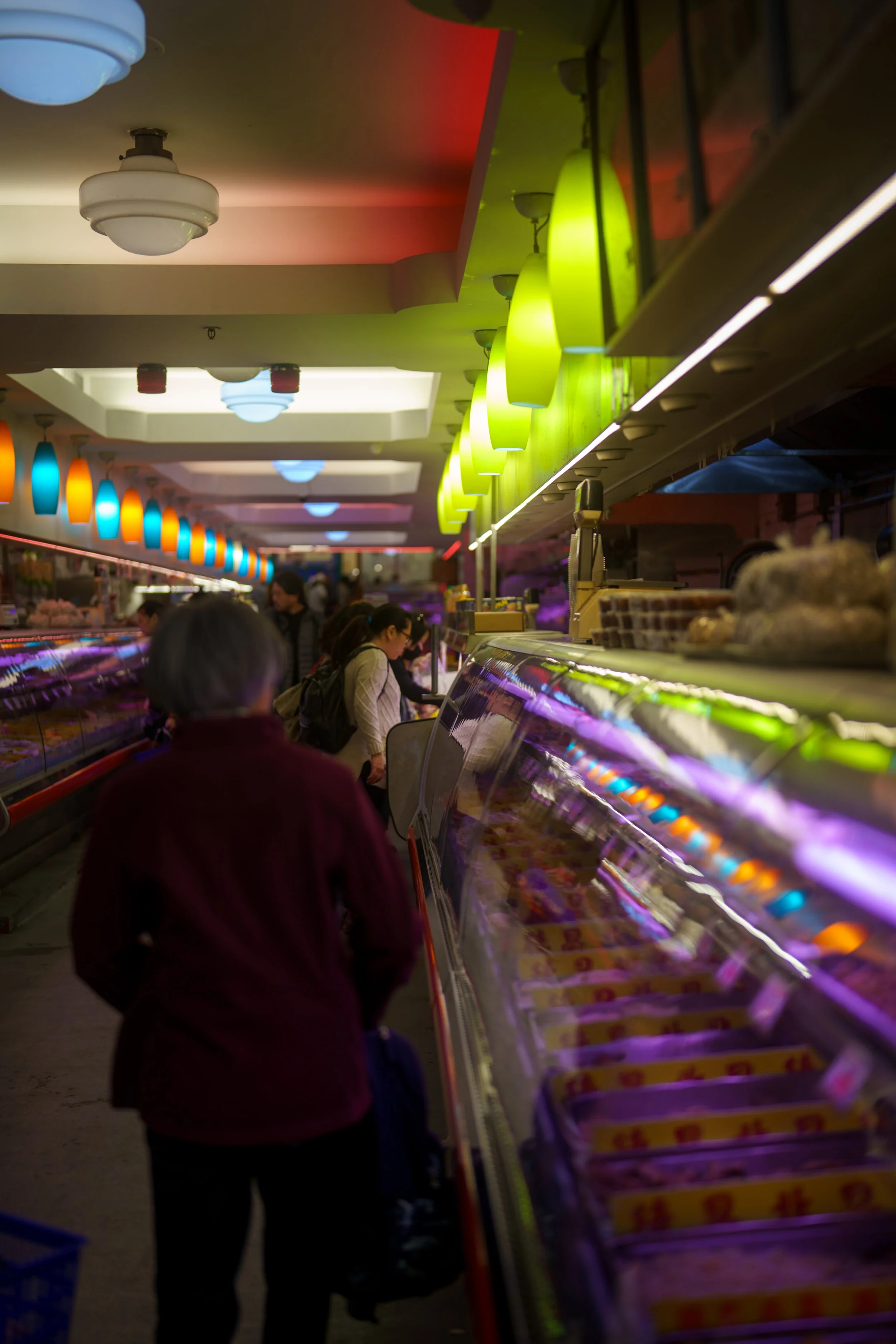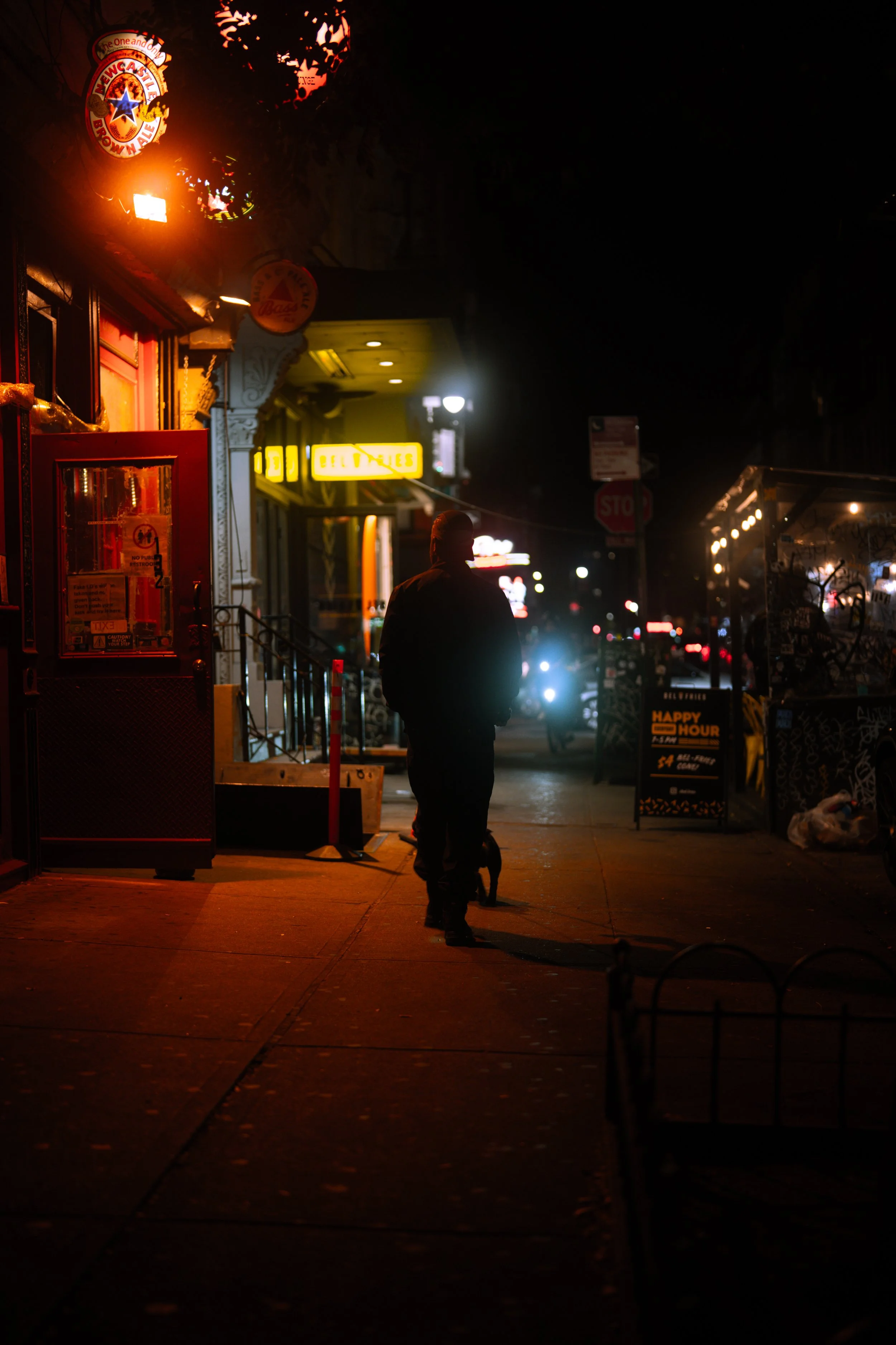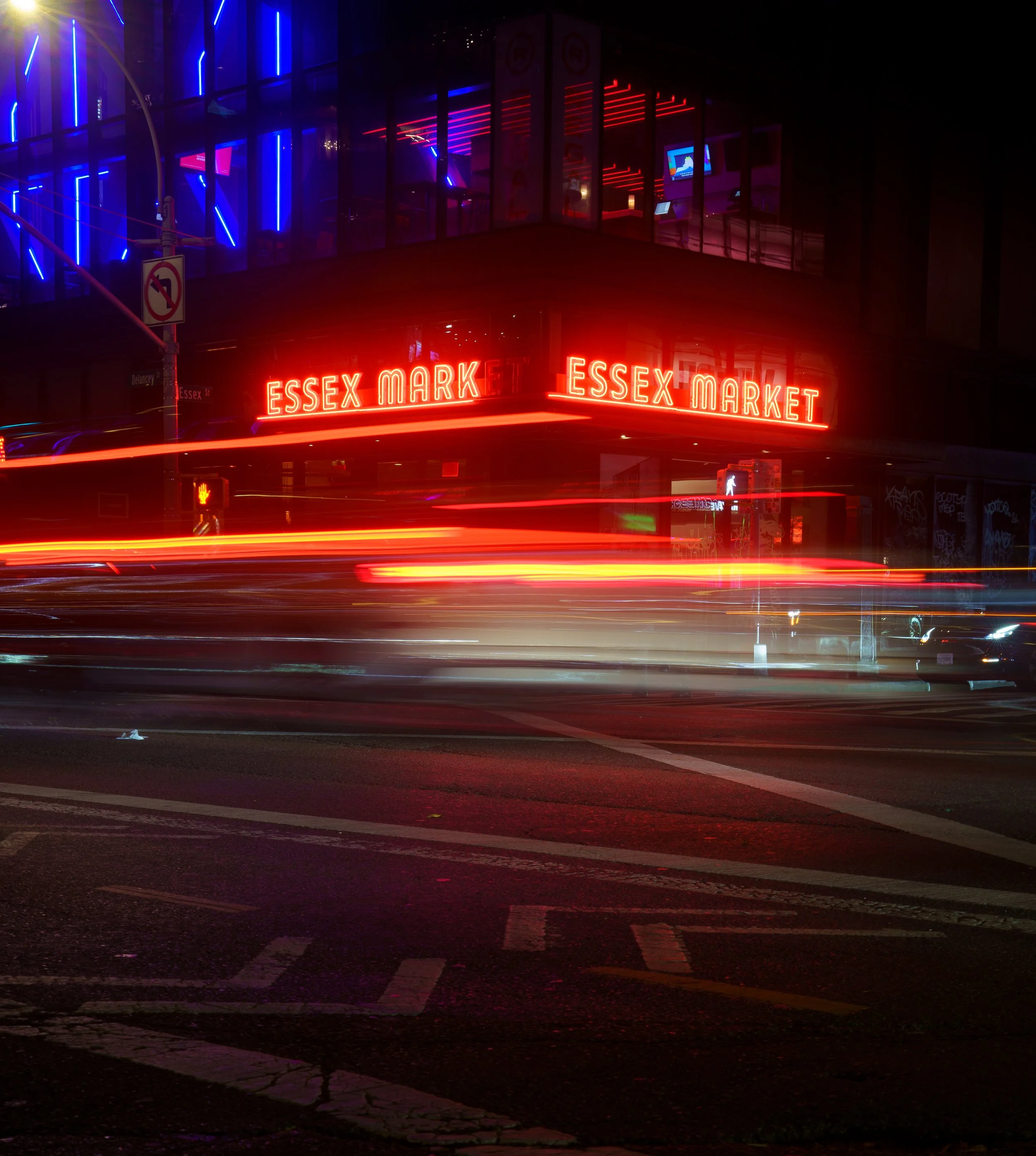 Neon signs in front of Katz's Deli advertising frankfurters, delicatessen, and sandwiches, with silhouetted people standing in line.