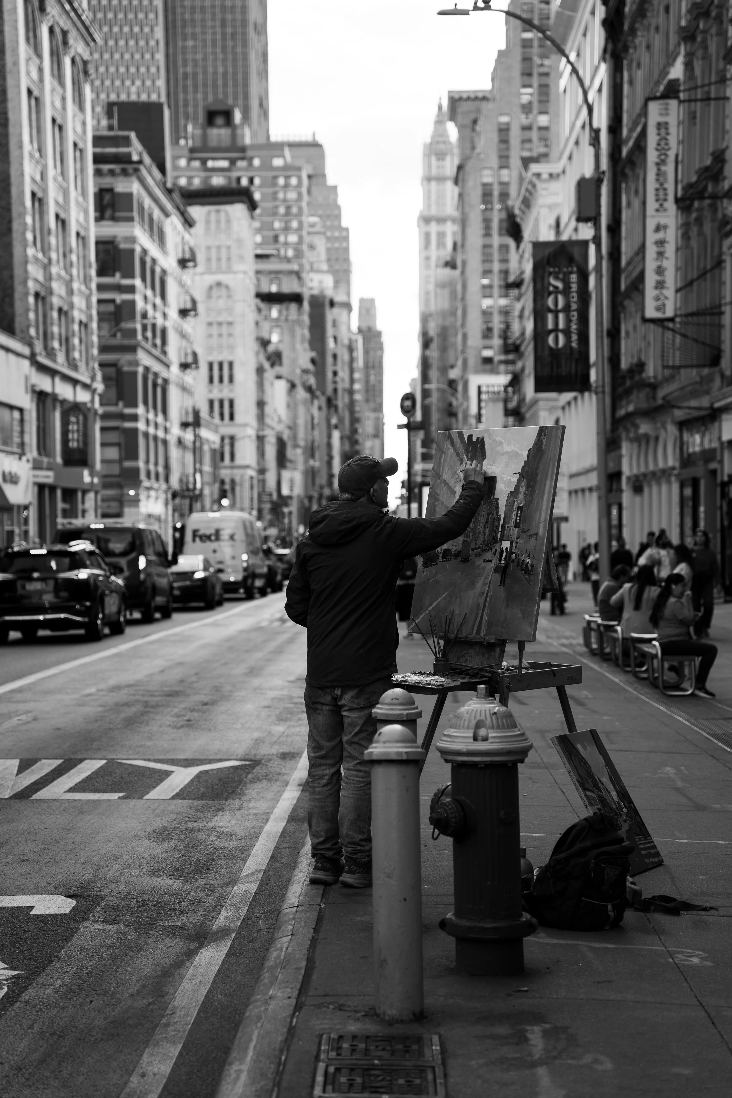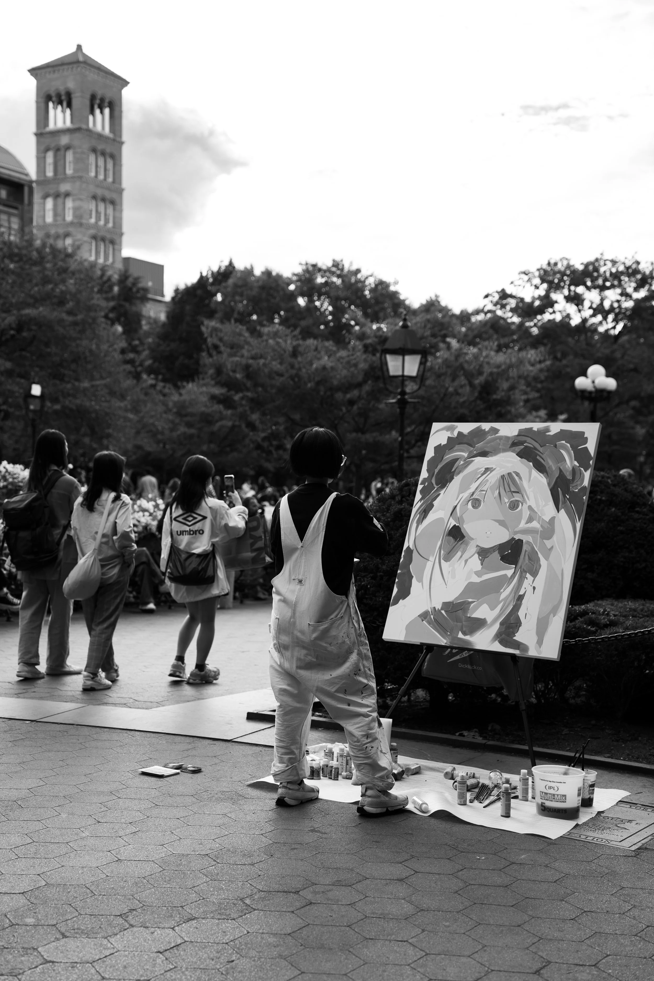 A street artist creating a large painting of an anime-style girl in an outdoor park, with spectators standing in line behind, and trees, street lamps, and a tall building in the background.