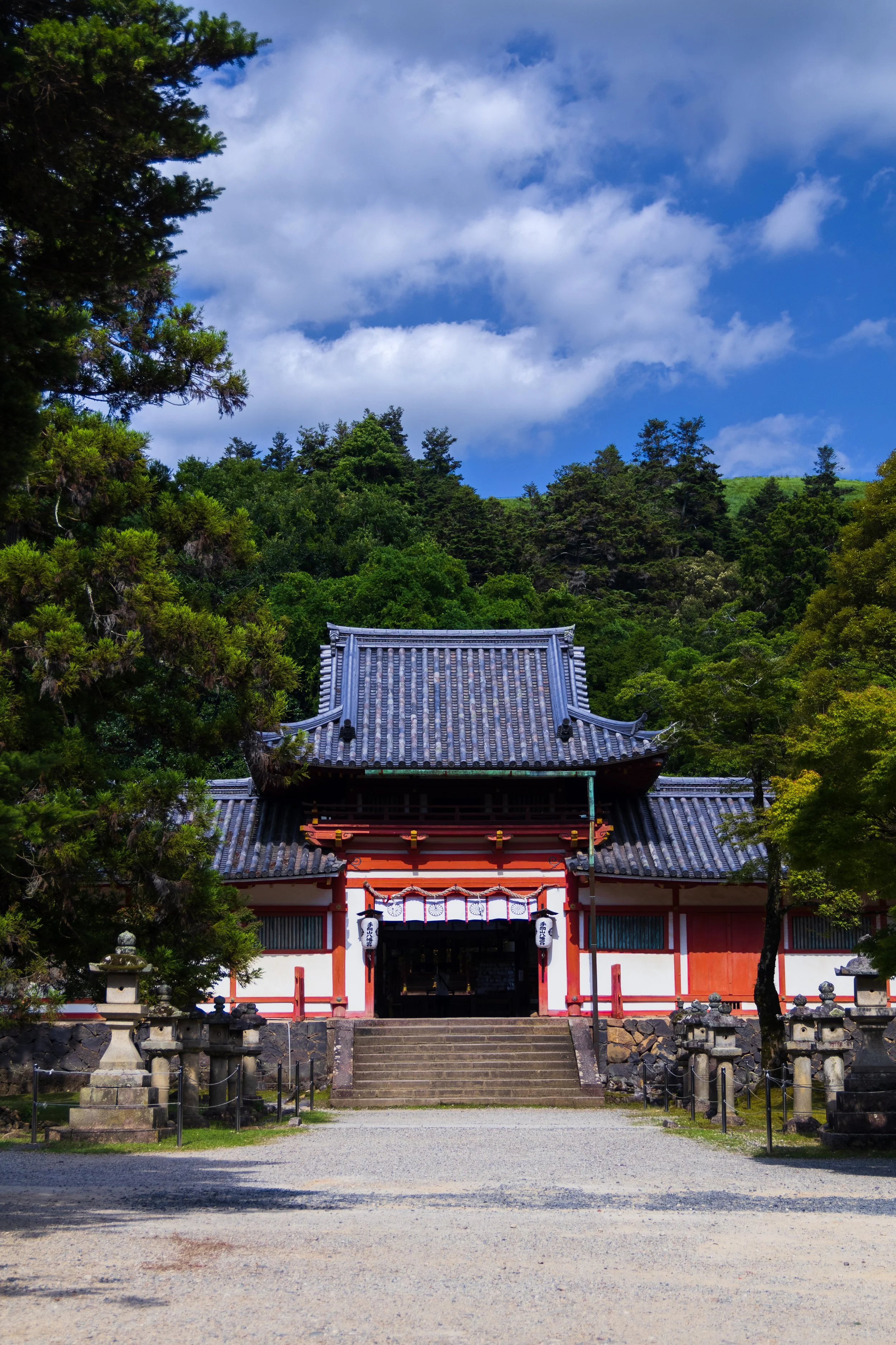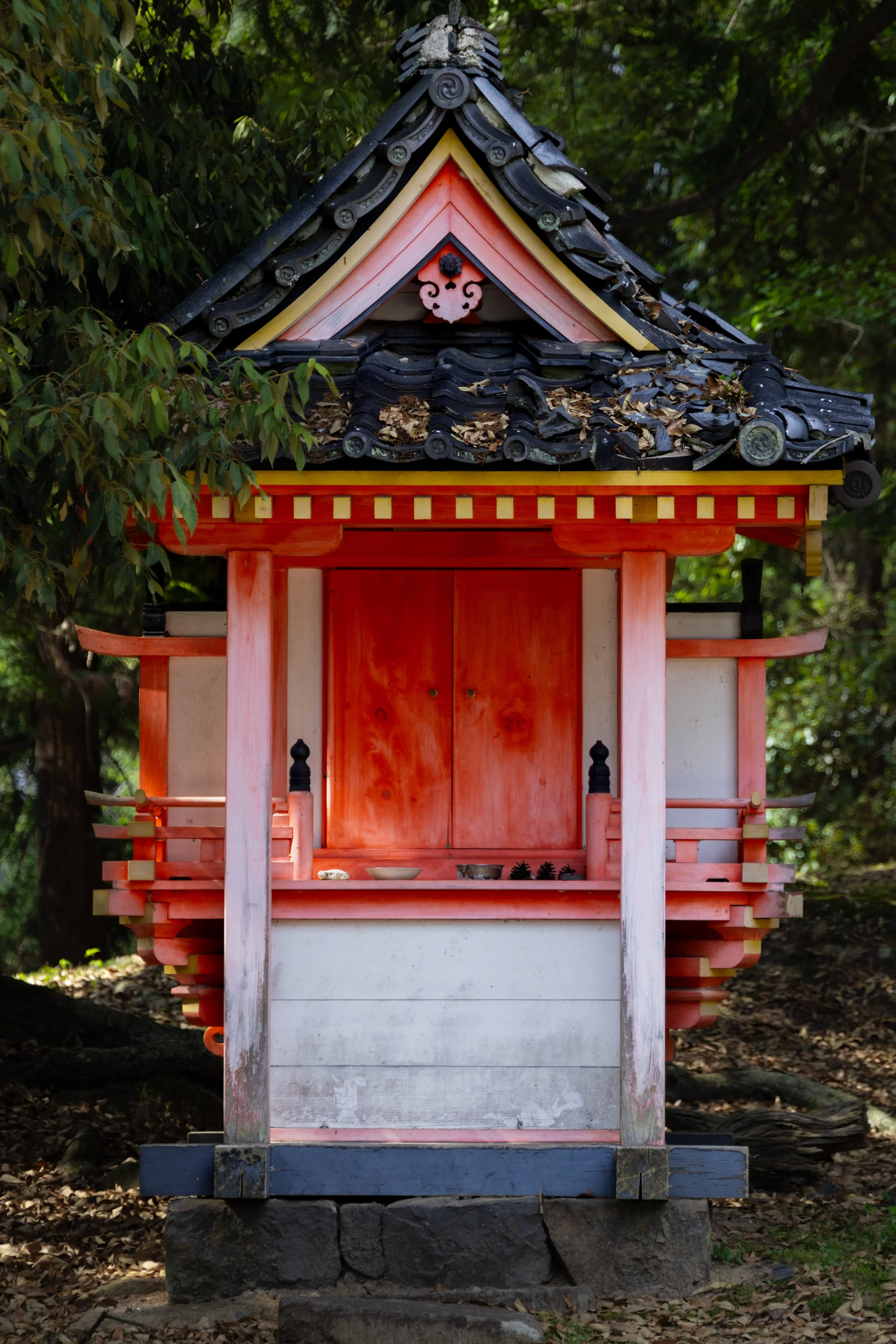 Night view of brightly lit Japanese signs on a building, including large vertical red and white illuminated signs with Japanese characters, various smaller neon signs advertising stores and services, and silhouettes of trees and pedestrians in the fo
