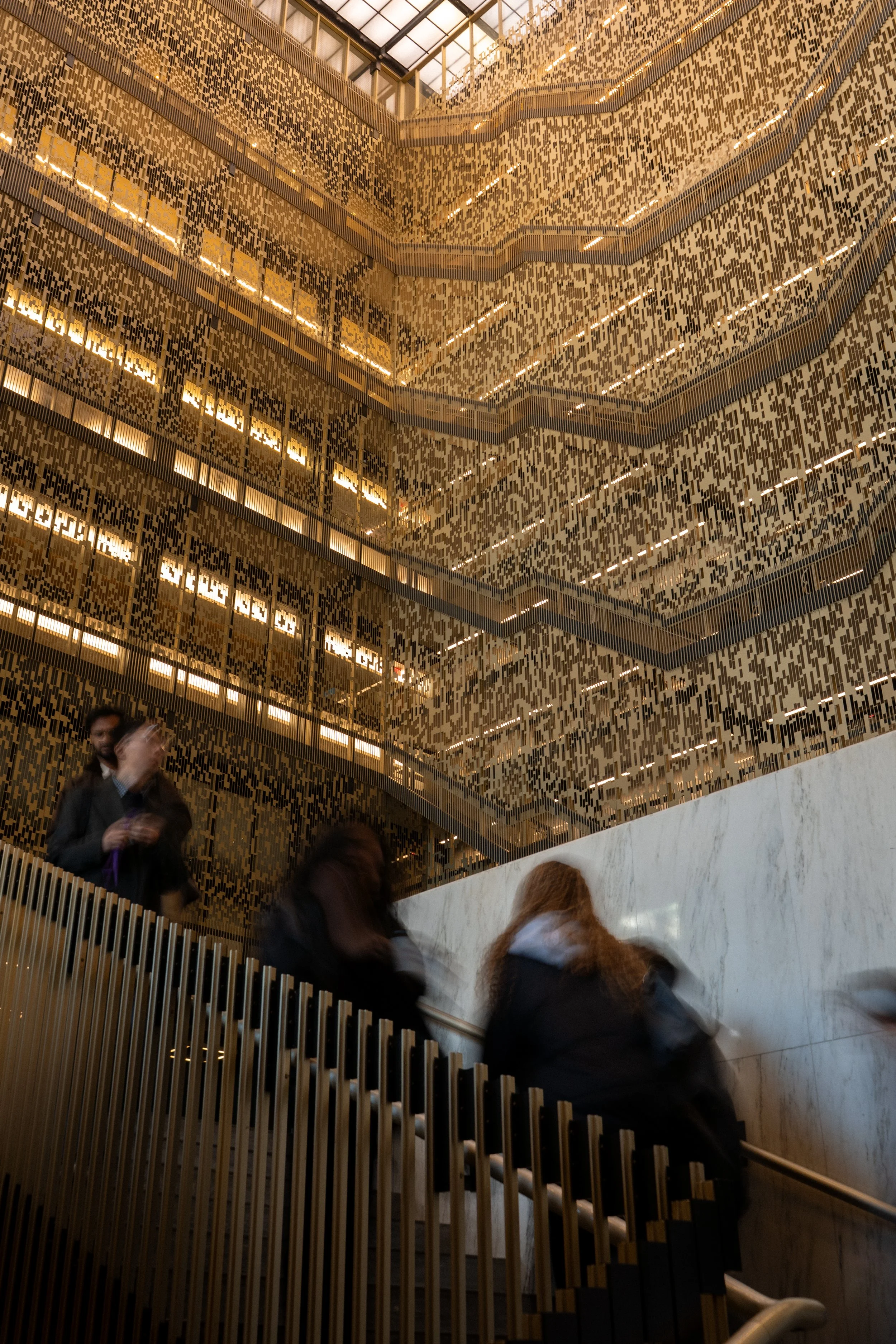 Top-down view of an indoor multi-level shopping mall or building with a unique honeycomb-like layout, escalators, and several people walking on different floors.