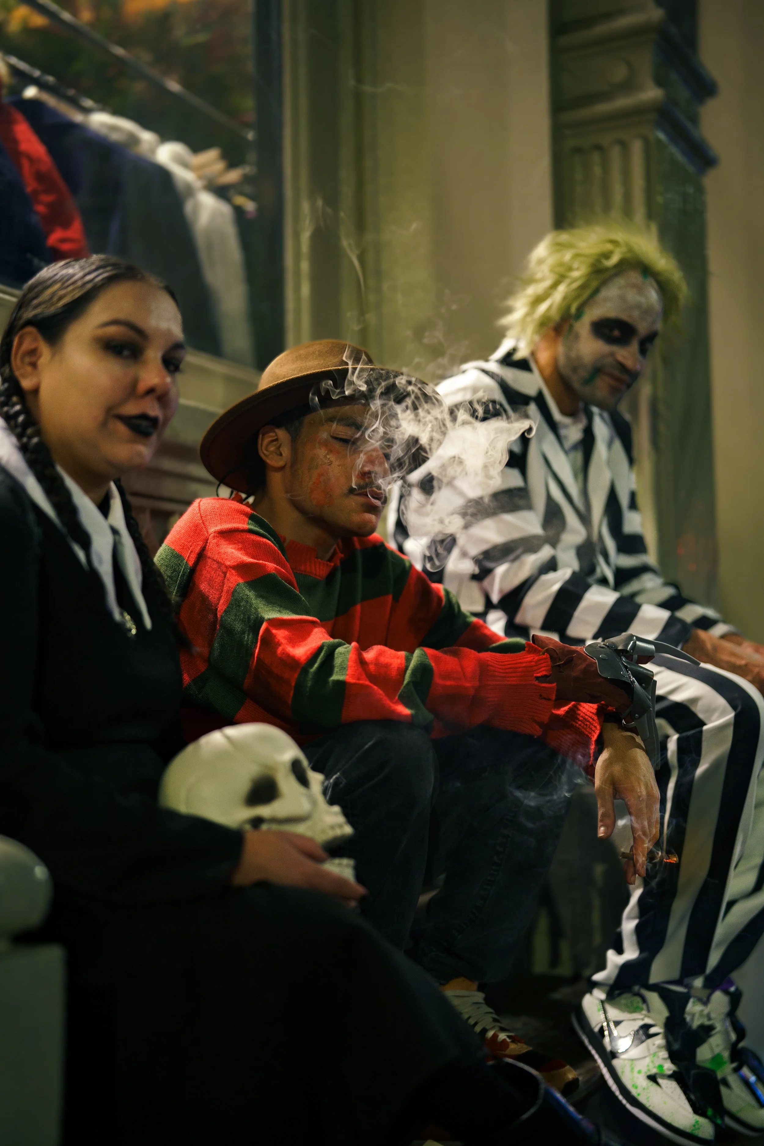 Three people dressed in Halloween costumes sitting on a sofa. The person on the left has braided hair, dark makeup, and is holding a skull prop. The person in the middle wears a cowboy hat, a red and green striped sweater, and is smoking. The person