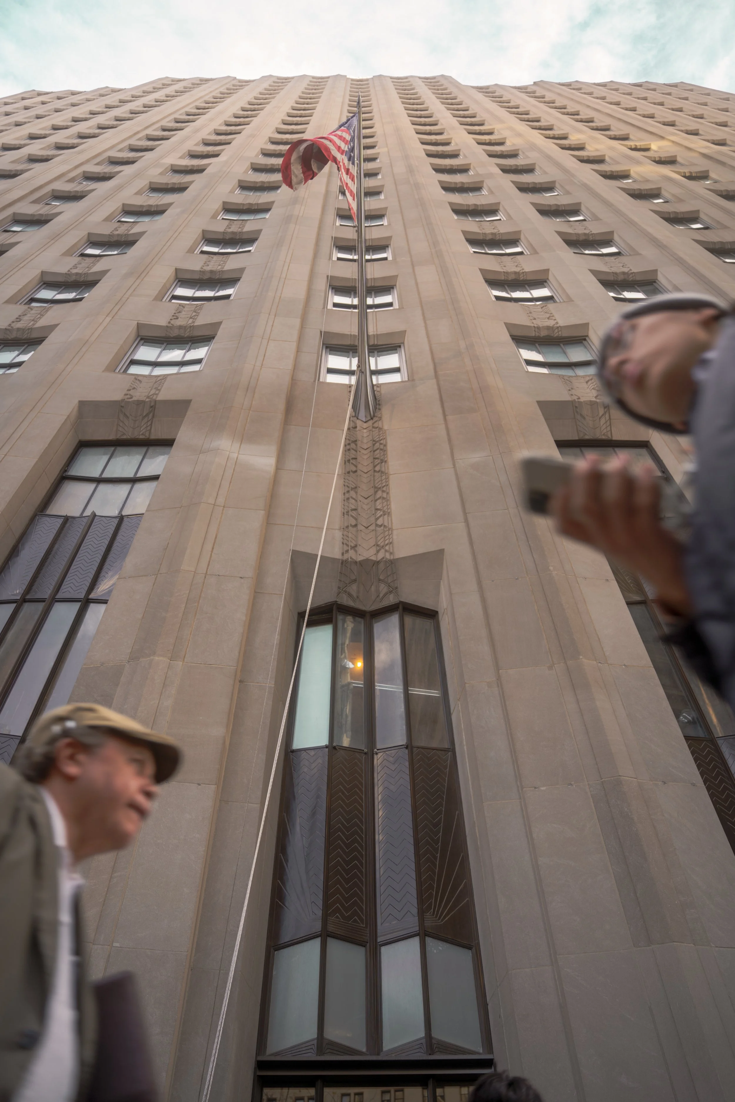 Low-angle view of a tall building with an American flag flying on a flagpole in front of it. People are walking by at the bottom of the image.