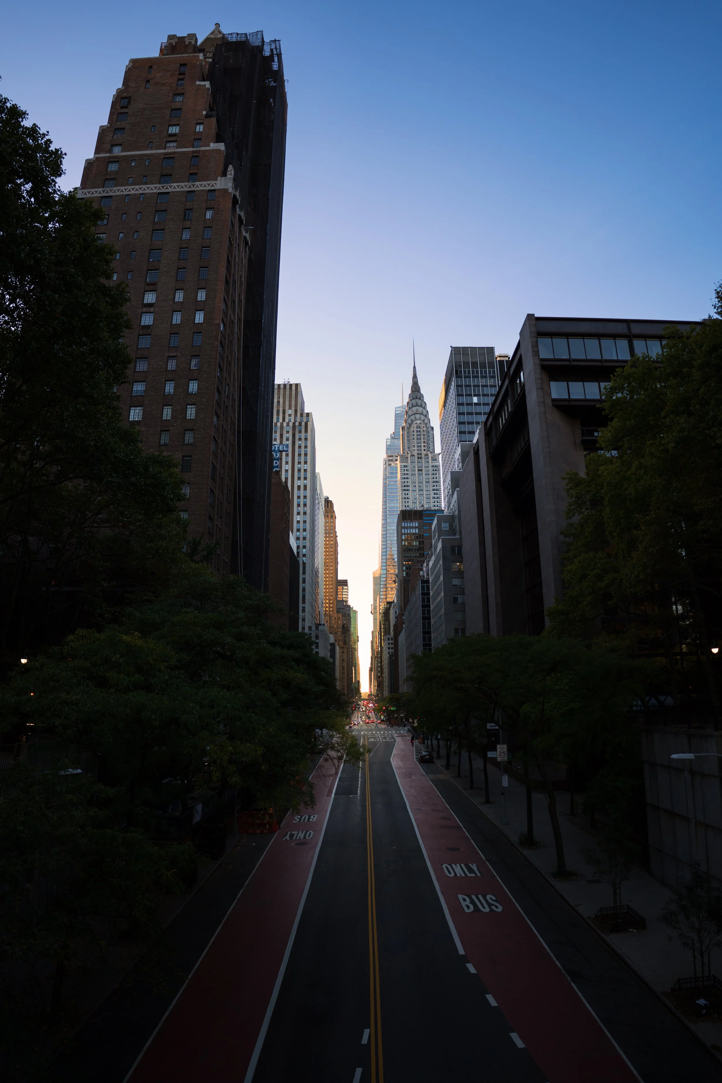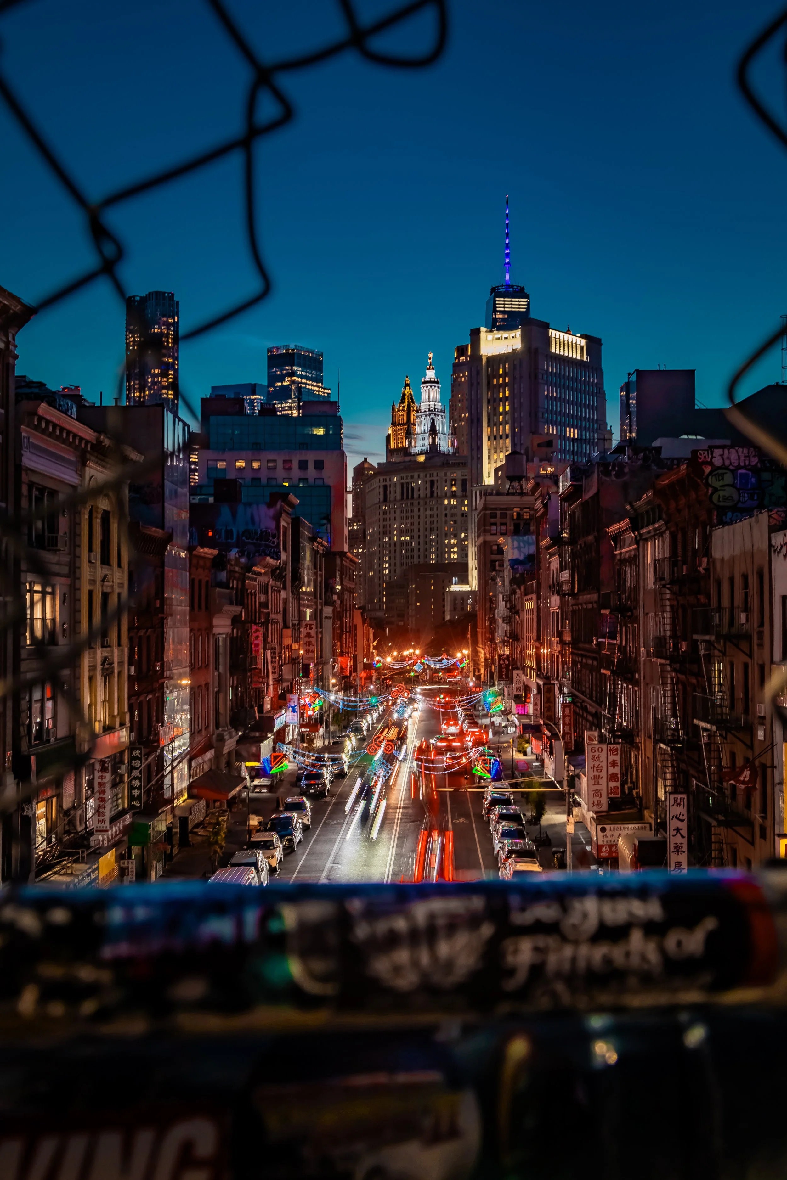 City street at dusk with colorful lights and high-rise buildings in the background, viewed through a blurred foreground.